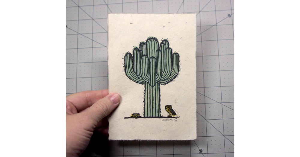 Saguaro Cactus and Burrowing Owl Linocut 5x7 Print, wall art, home decor, gift, desert art