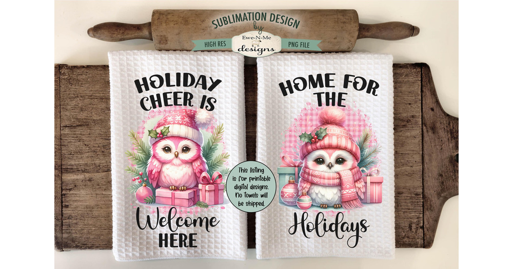 Pink Holiday Owls Towel Sublimation Designs - Home For Holidays Sublimation Designs - Holiday Cheer