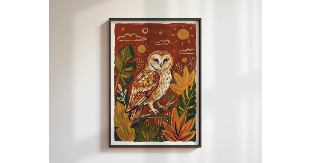 Earthy Barn Owl Print, Whimsical Folk Nature Illustration, Bohemian Wall Hanging