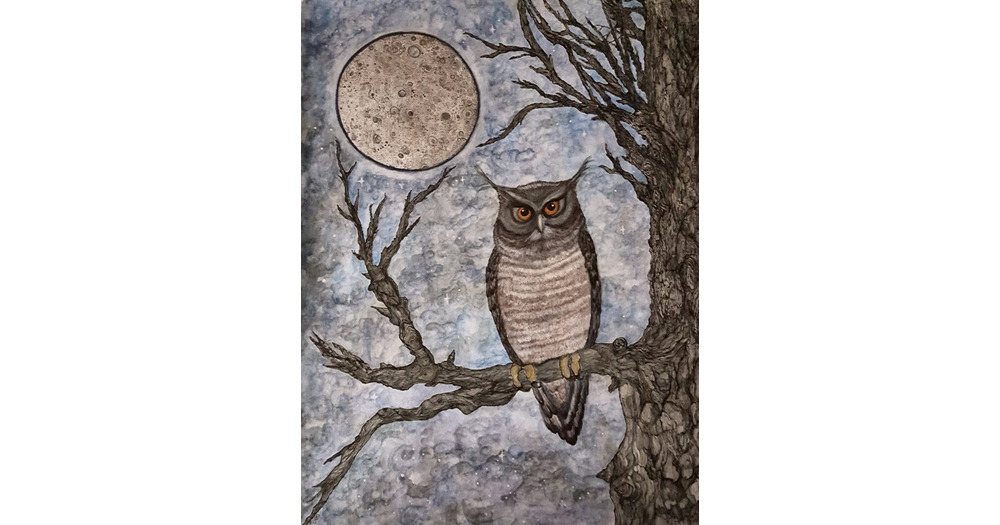 Owl in Tree - Full moon-Original painted drawing, "The Watcher" is on Bristol paper- inks/