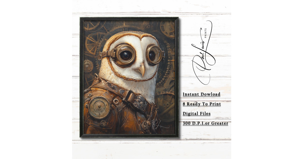 Steampunk Barn Owl Character Portrait - Vintage Fantasy Wall Art, Moody Owl in Brass, Steampunk Deco