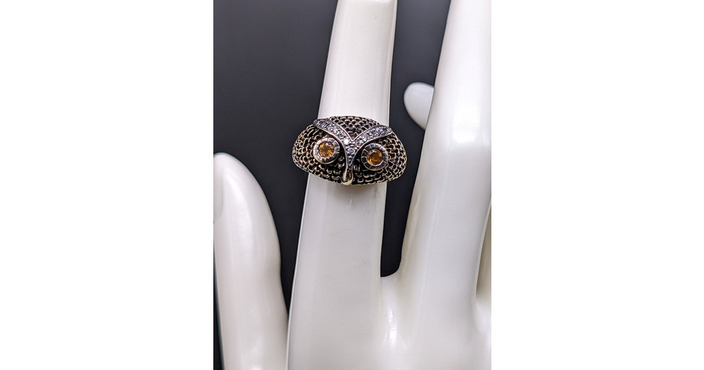 Vintage Vermeil Sterling Silver Owl Ring: Citrine Eyes, Diamond Accents