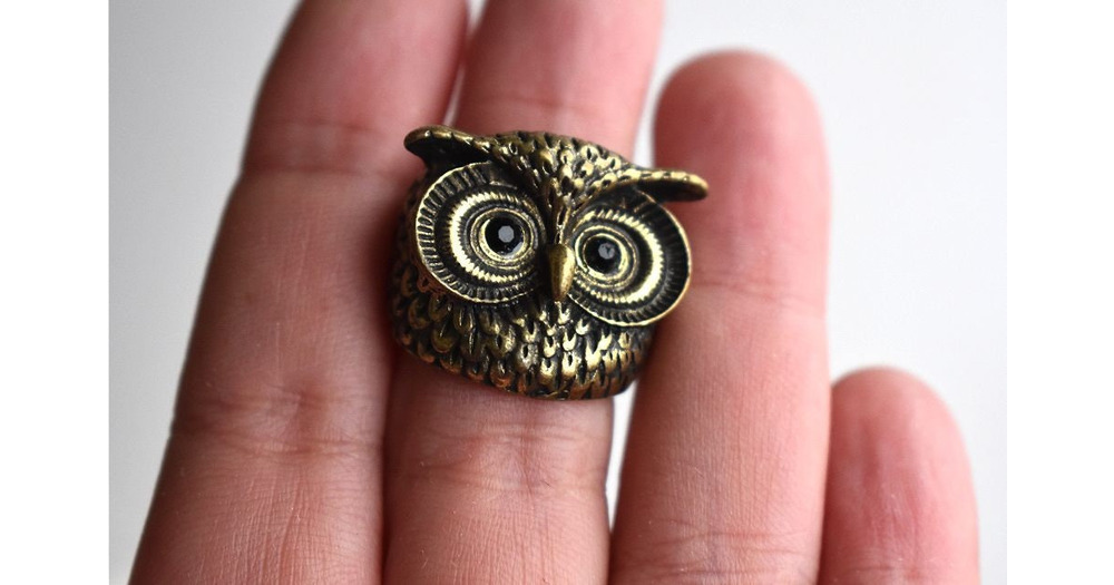 Vintage Brass Owl Ring Bird Statement Jewelry Gold Metal MCM Unisex Fashion Jewelry Glass Crystal Ey