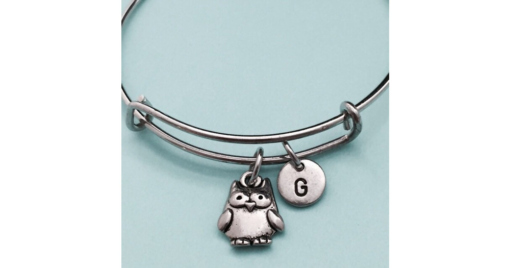 Owl bangle, owl charm bracelet, expandable bangle, charm bangle, personalized bracelet, initial brac