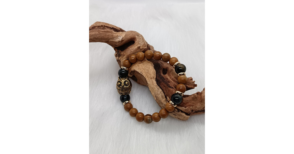 Bracelet "hibou" en bois fossilisé et œil de faucon