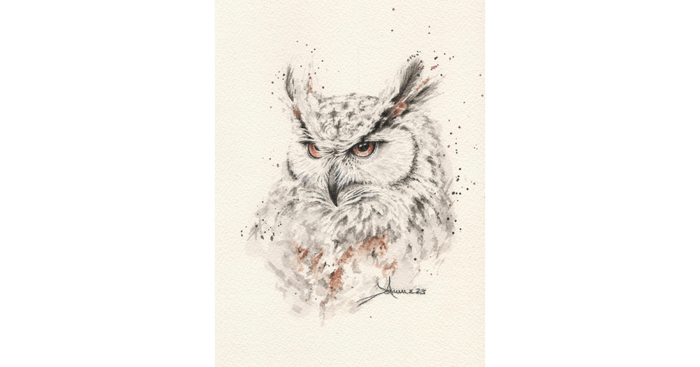Bird-Owl Portrait Original watercolor painting, 6 x 8inches. Raptor. Birds of Prey. Black and gold