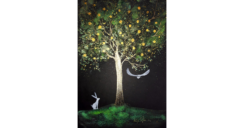 Mystical Print, Apple Tree, White Hare, White Owl, Shimmering Print, Quality Print