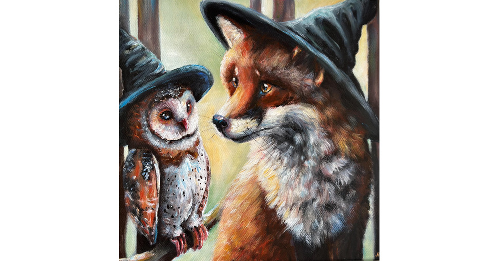 Original canvas painting Witchy Fox and Barn Owl, Fox wall art, Barn owl painting, Whitchy art, Wild