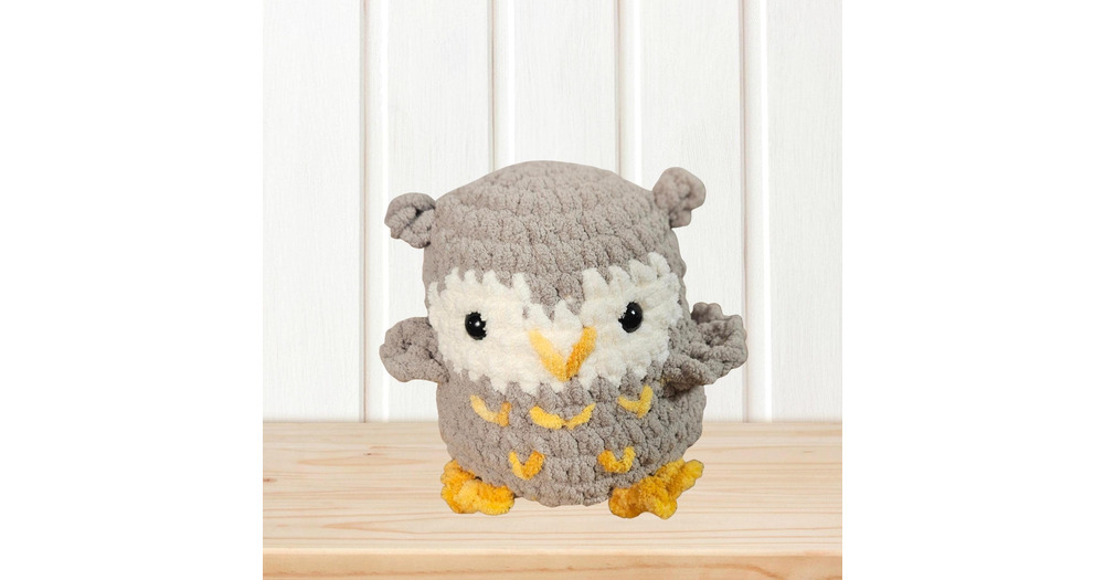 Gray and White Owl Plushie Crochet Owl Stuffed Animal Baby Safe Owl Plush with Embroidered Eyes Wood