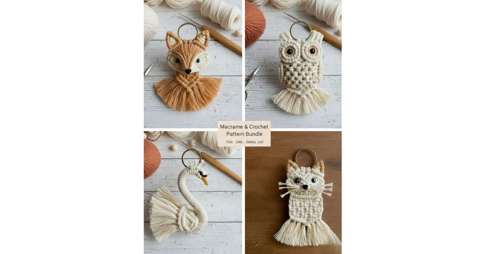 Animal Macrame and Crochet Keychain Pattern Bundle - DIY Fox, Owl, Swan, and Cat Keychain Tutorial -