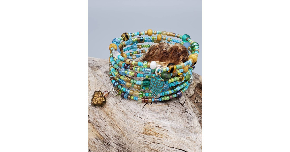 Boho Chic Memory Wire Bracelet: Owl & Leaf Charms, Multi-Color