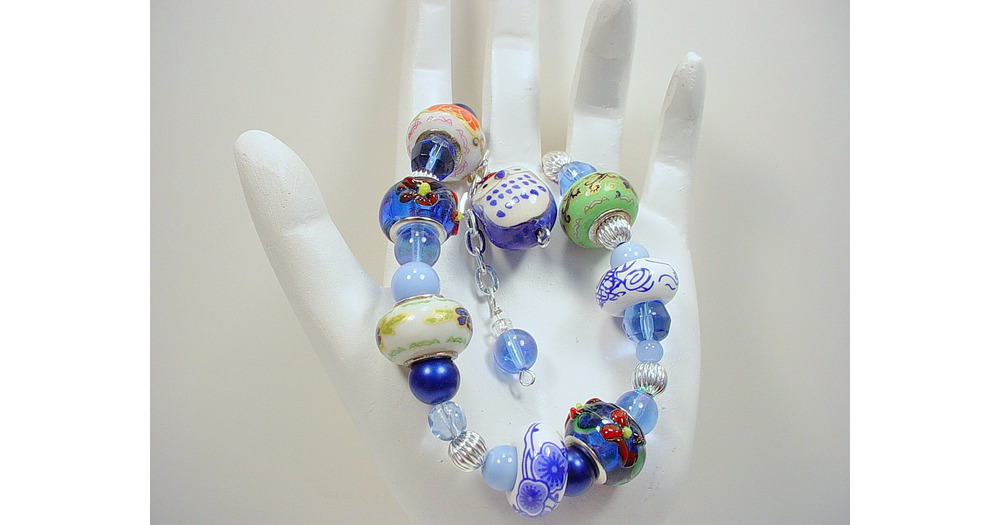 Bracelet with Owl Charm and Crystal, Glass Pearl, Lampwork and Metal Beads in Blue and Silver with G