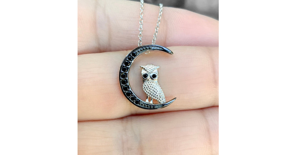 Sterling Silver Owl Necklace: Black CZ Crescent Moon, Wiccan Jewelry