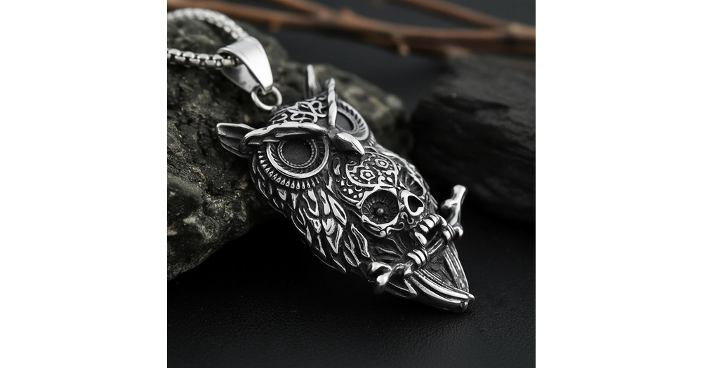 Men's Gothic Owl Skull Pendant Necklace, Stainless Steel Viking Biker Jewelry, Dark Totem Amulet