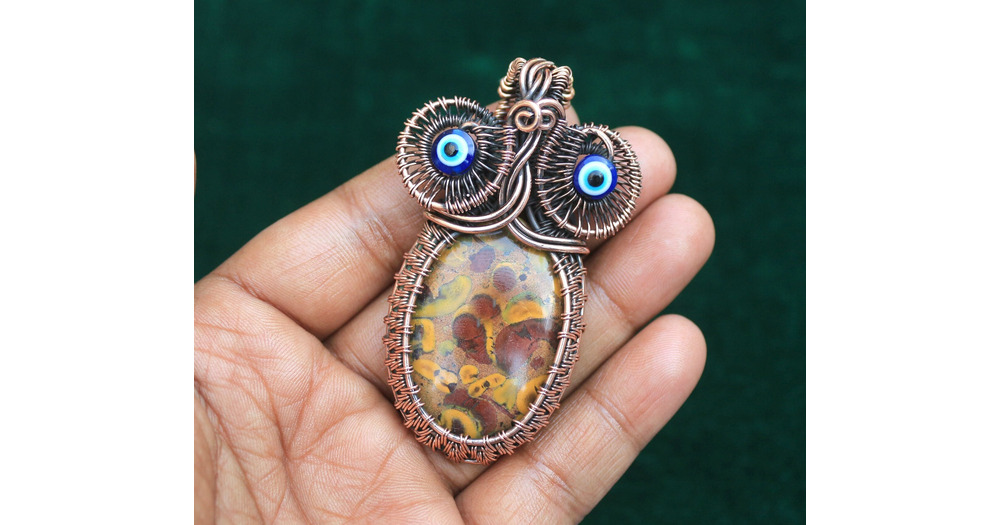 Owl Fruit Jasper Copper Wire Wrapped Pendant: Gemstone Necklace
