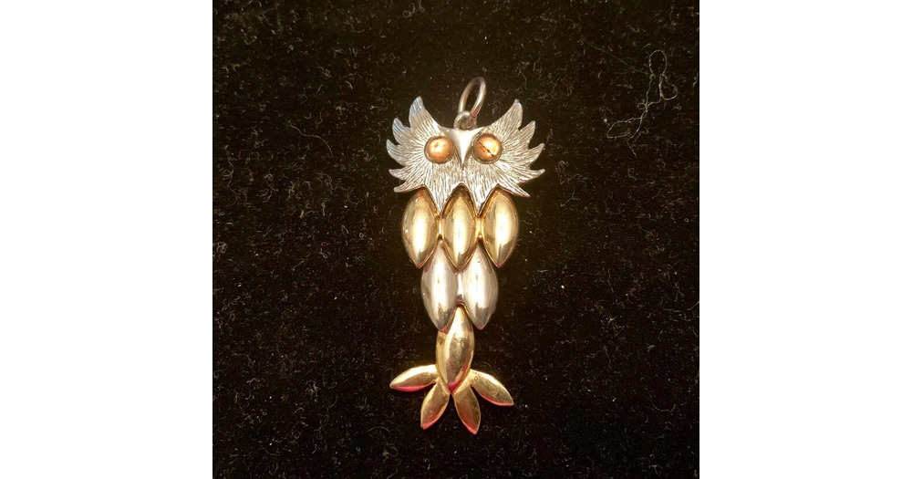 Vintage Silver and Gold Owl Pendant with Amber Eyes