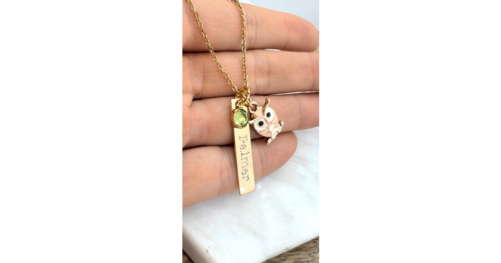 Personalized Owl Necklace: Gold Filled Bar, Crystal, Enamel Charm