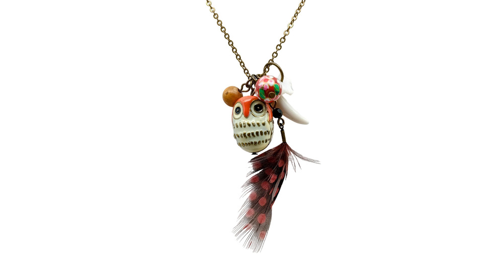 Vintage Owl Pendant Necklace with Feather & Beads in Mixed Materials