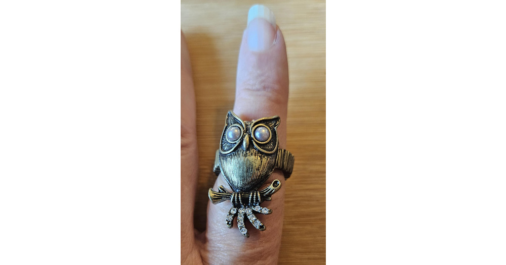 Vintage stretch ring of an owl with pearl eyes Mark by Avon in original box.