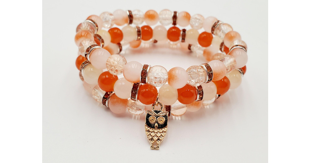 Autumn Owl Bracelet Set: Crackle Glass Beaded Stack, Fall Jewelry
