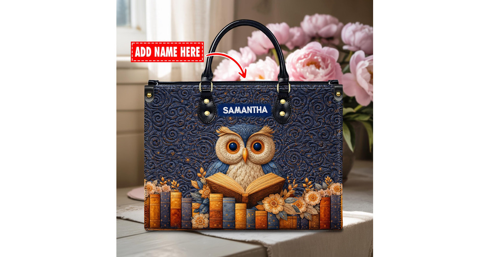 Personalized Owl Reading Books Leather Handbag with Custom Name , Artistic Owl and Book Stack Bag ,