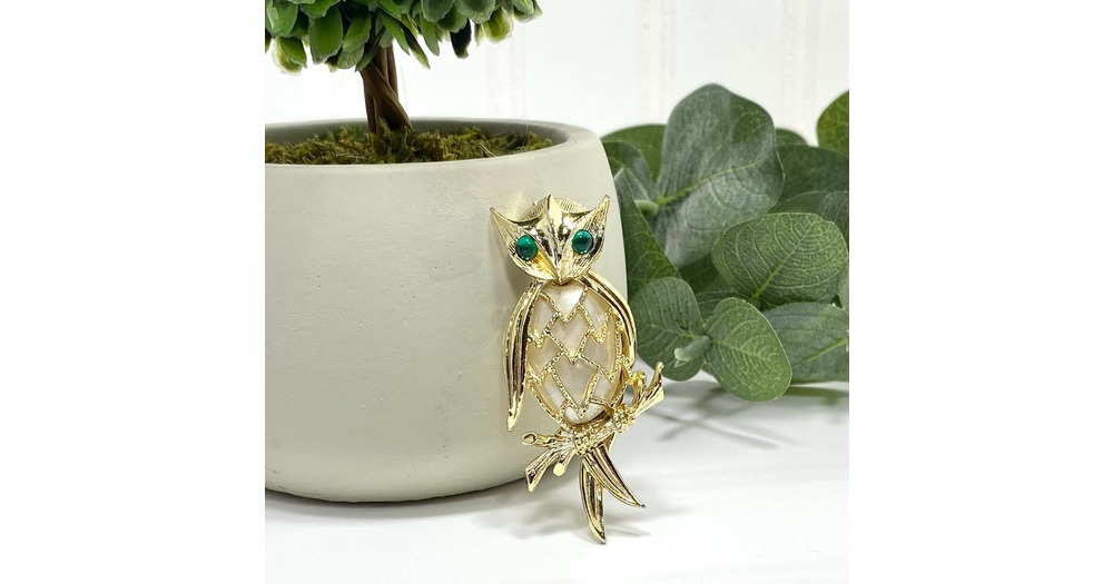 Vintage OWL BROOCH, Owl Pin, Featuring Emerald Green Eyes & Pearlized Belly