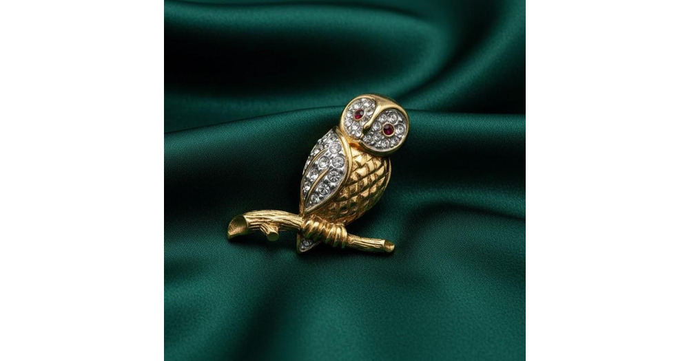 Crystal Owl Brooch, Gold Plated Bird Pin, Ruby Eye Owl, 925 Sterling Silver