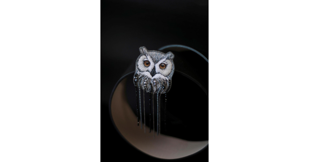 Embroidered Owl Brooch with crystals and chains - Christmas gift for bird lovers