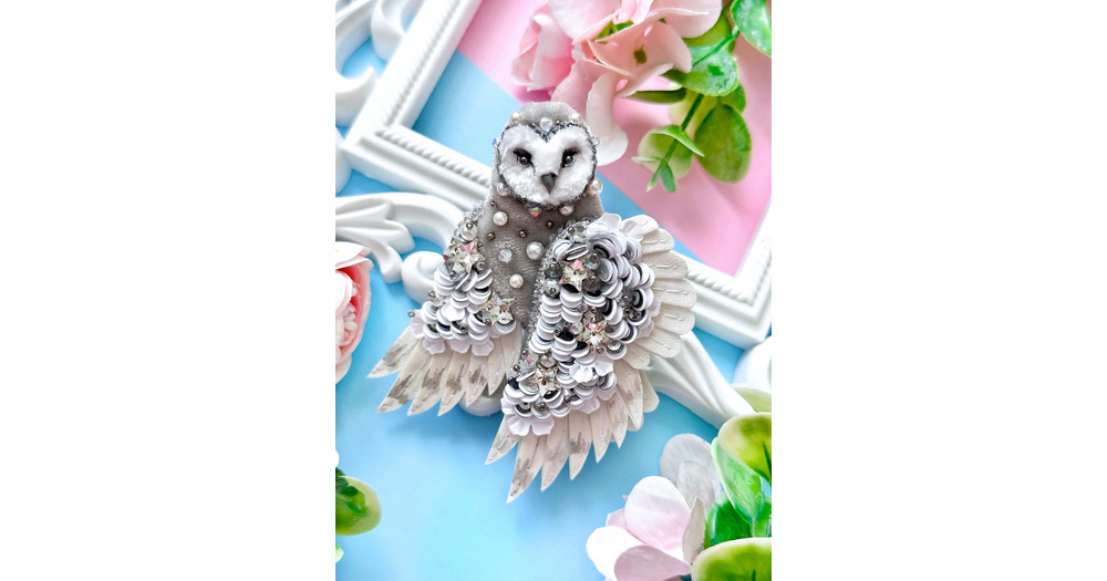 Handmade Barn Owl Brooch, Embroidered Crystal Bird Pin