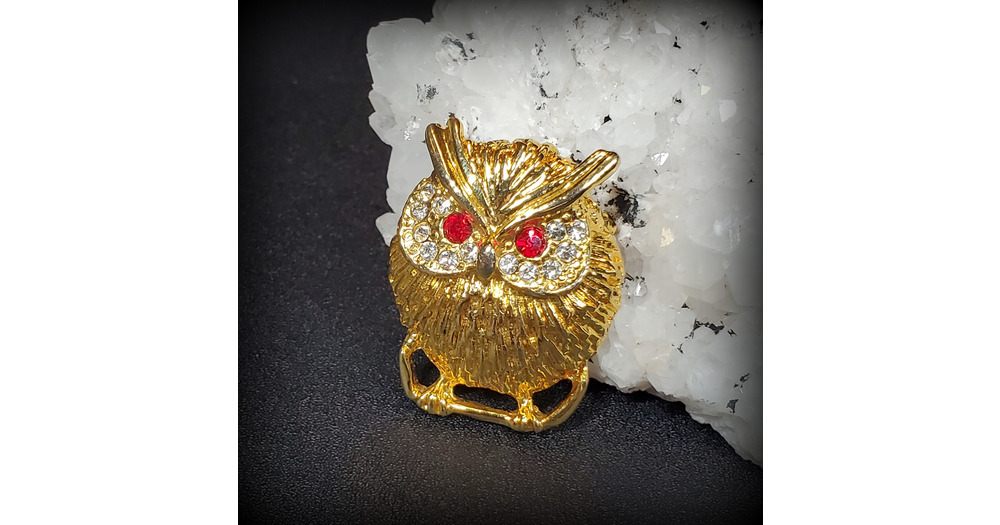 Vintage gold owl brooch, figural brooch, large Owl pin, red eye owl jewelry