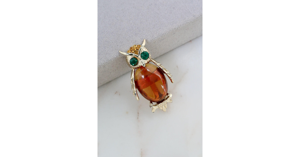 Vintage Rhinestone Amber Glass Owl Gold Brooch
