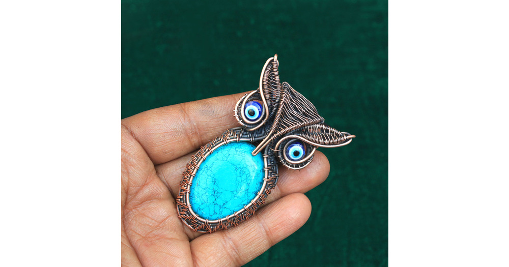 Owl Turquoise Copper Wire Wrap Pendant, Oxidized Copper Jewelry