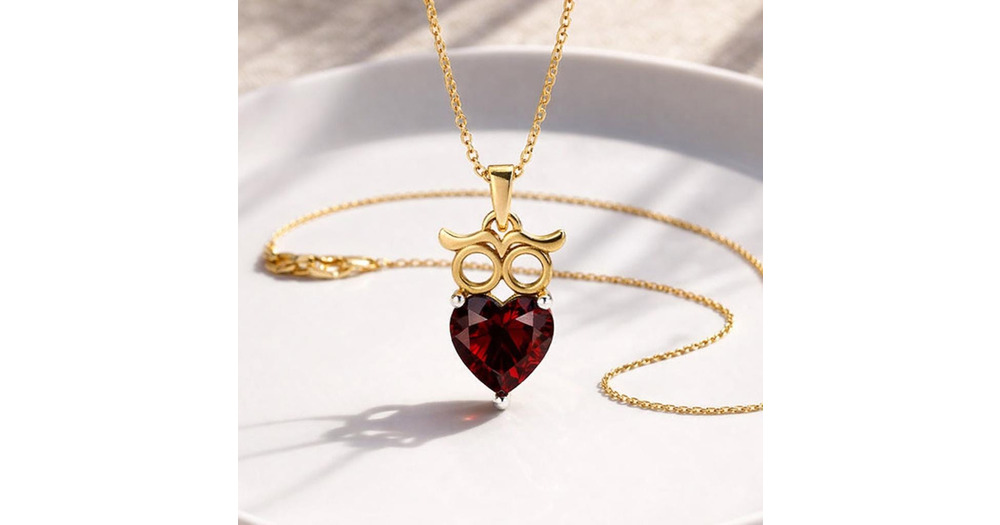 Dainty Garnet Heart Owl Necklace: Sterling Silver, Gold-Plated