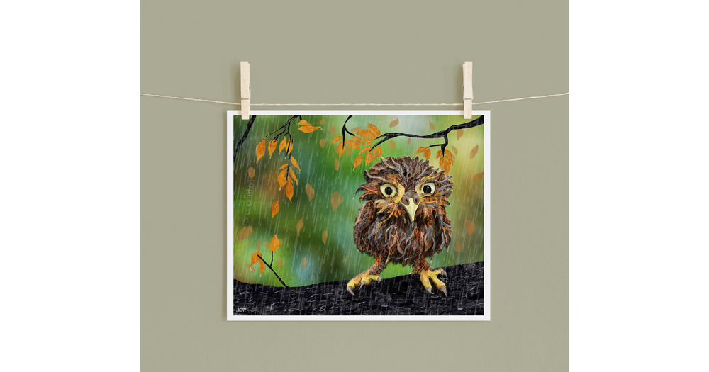 Wet Owl Art Print: Rainy Day Mixed Media Collage (8x10)