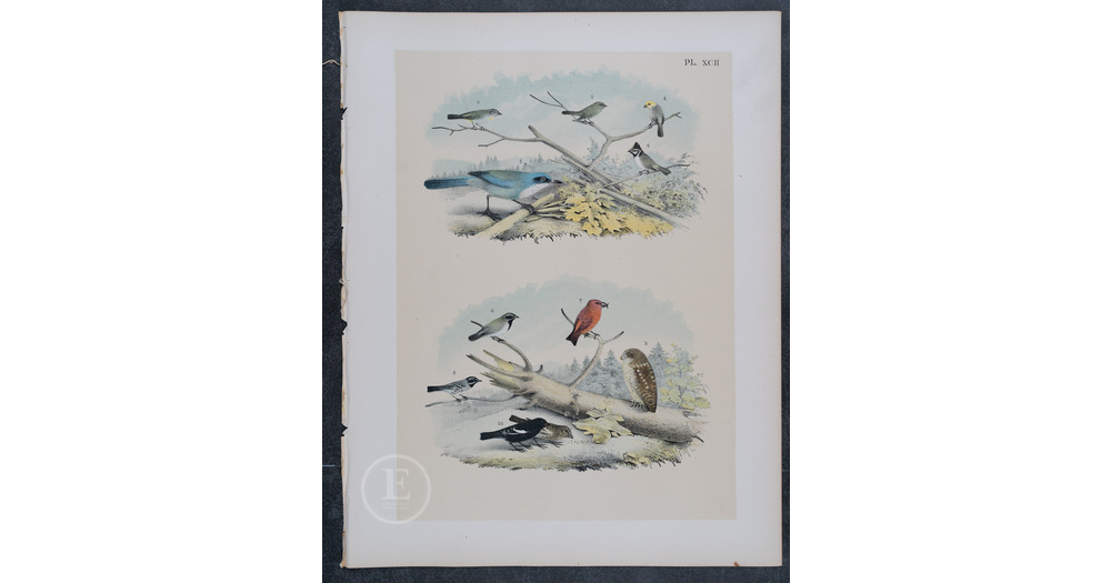 1878 American Red Crossbill, Jay, Titmouse, Warbler, Owl, Lark Bunting, - Original Chromolithograph