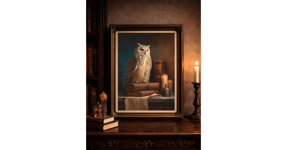 Wise Owl and Ancient Scrolls Oil Painting, Mystical Guardian of Knowledge Art, Gothic Library Schola