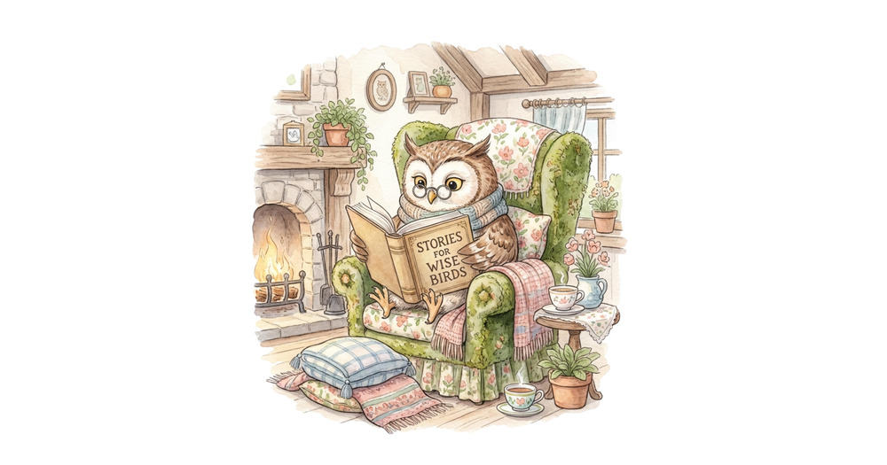 Owl Reading Clipart: Watercolor Cozy Cottagecore Animal (PNG Download)