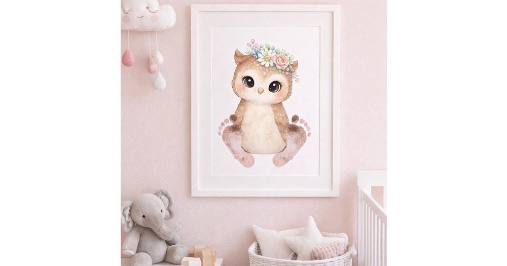 Baby Owl Footprint Print, Woodland Nursery Watercolor, Animal Wall Decor (Digital Download)