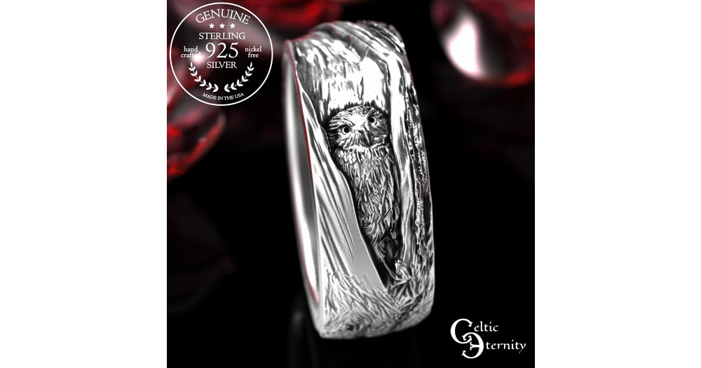 Sterling Silver Owl Wedding Ring, Hoot Owl Wedding Band, 925 Tree Bark Wedding Rings, Night Owl Wedd
