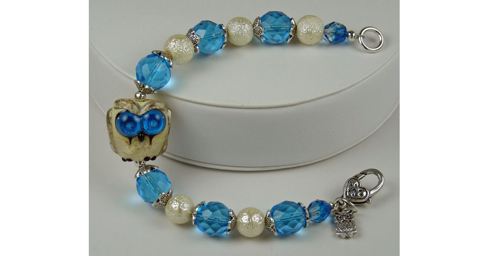 BLUE EYED OWL:  Artist Lampwork Glass Vibrant Sapphire Blue Silver Ivory Bracelet
