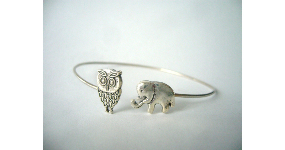 silver elephant and owl bracelet, animal bracelet, charm bracelet, bangle