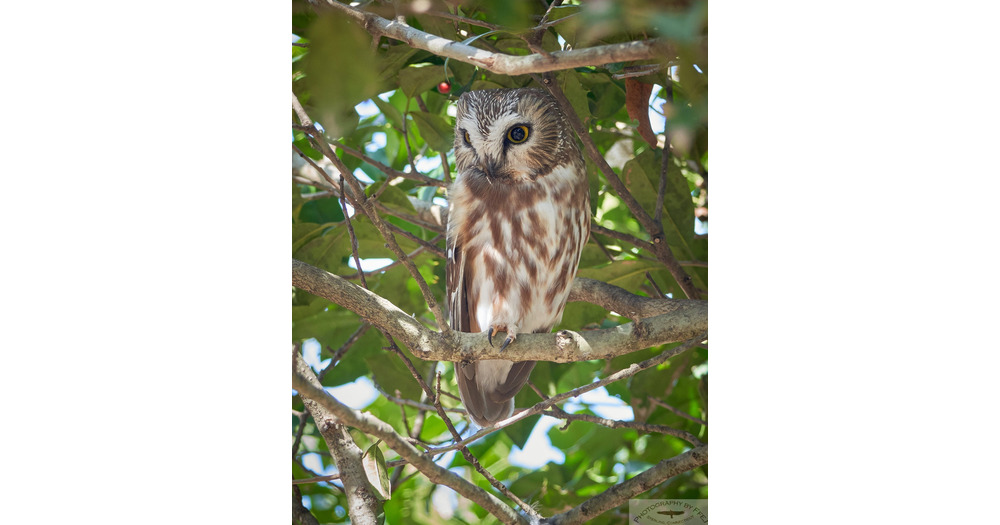 Photograph of a Northern saw-whet Owl perched in a Holly tree, Greenwich, CT