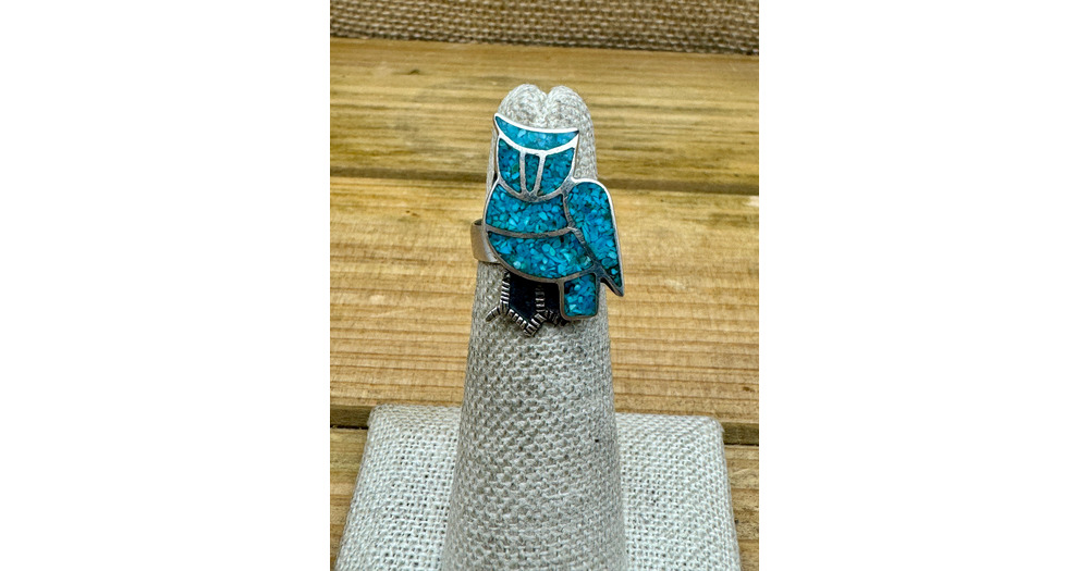 Vintage Sterling Silver Turquoise Chip Inlay Owl Ring Size 4.25