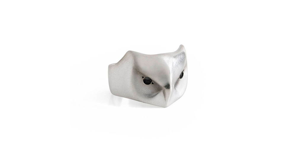 Great Horned Owl Ring, Sterling Silver with Black Diamond Eyes