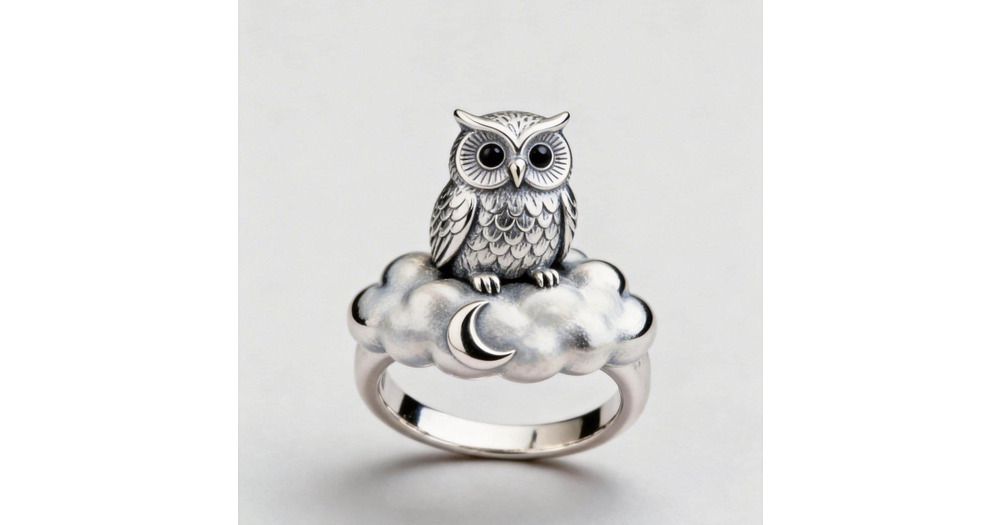 Sterling Silver Owl Cloud Moon Ring, Whimsical Night Sky Jewelry