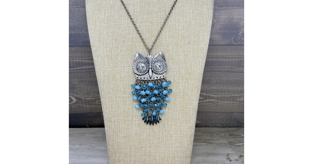 Vintage Silver Tone and Blue Bead Articulated Owl Pendant Necklace 32 Inch