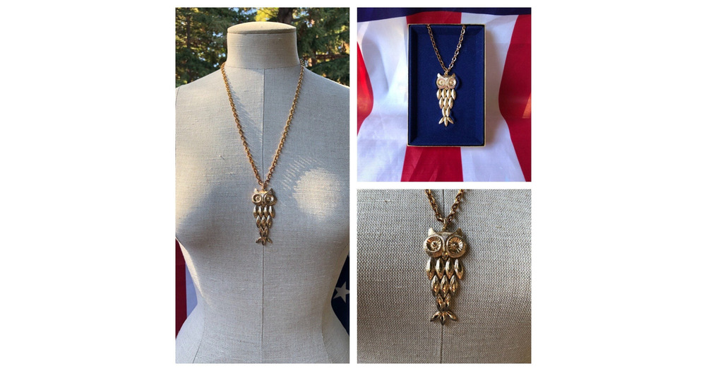Never Worn NIB Vintage Gold Tone Articulated Owl Pendant Necklace In The Original Box Dated 1974 ~ A