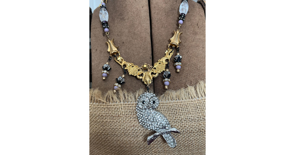 Vintage Rhinestone Owl Bib Necklace: Vintage Swarovski Crystals, Ornate Spacers, Matte Black