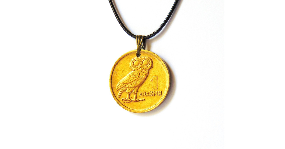 Coin Necklace - Pendant Wise Owl 1973 One Drachma Coin Greece – Owl symbol of goddess Athena -