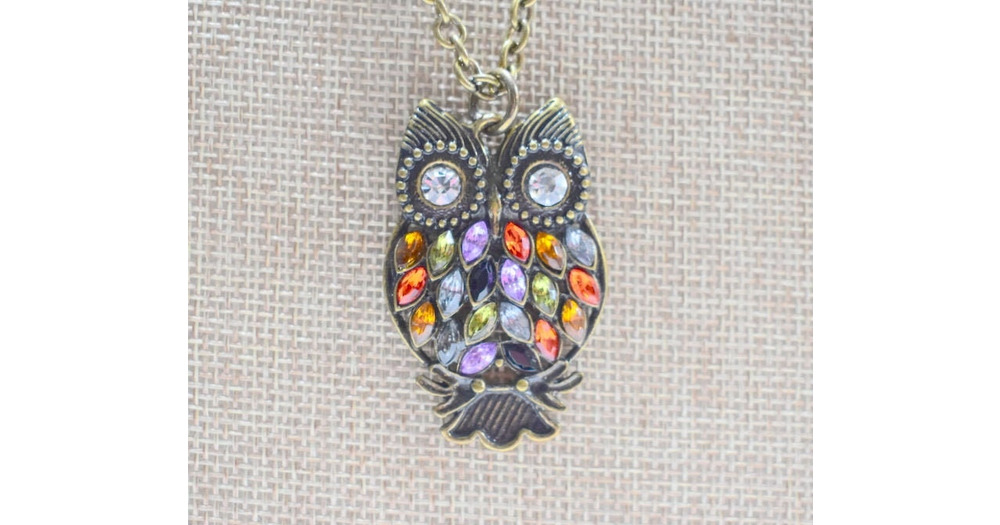 Necklace Owl Large Pendant Matinee Length Costume Jewelry Signed Tag Metal Alloy Crystals